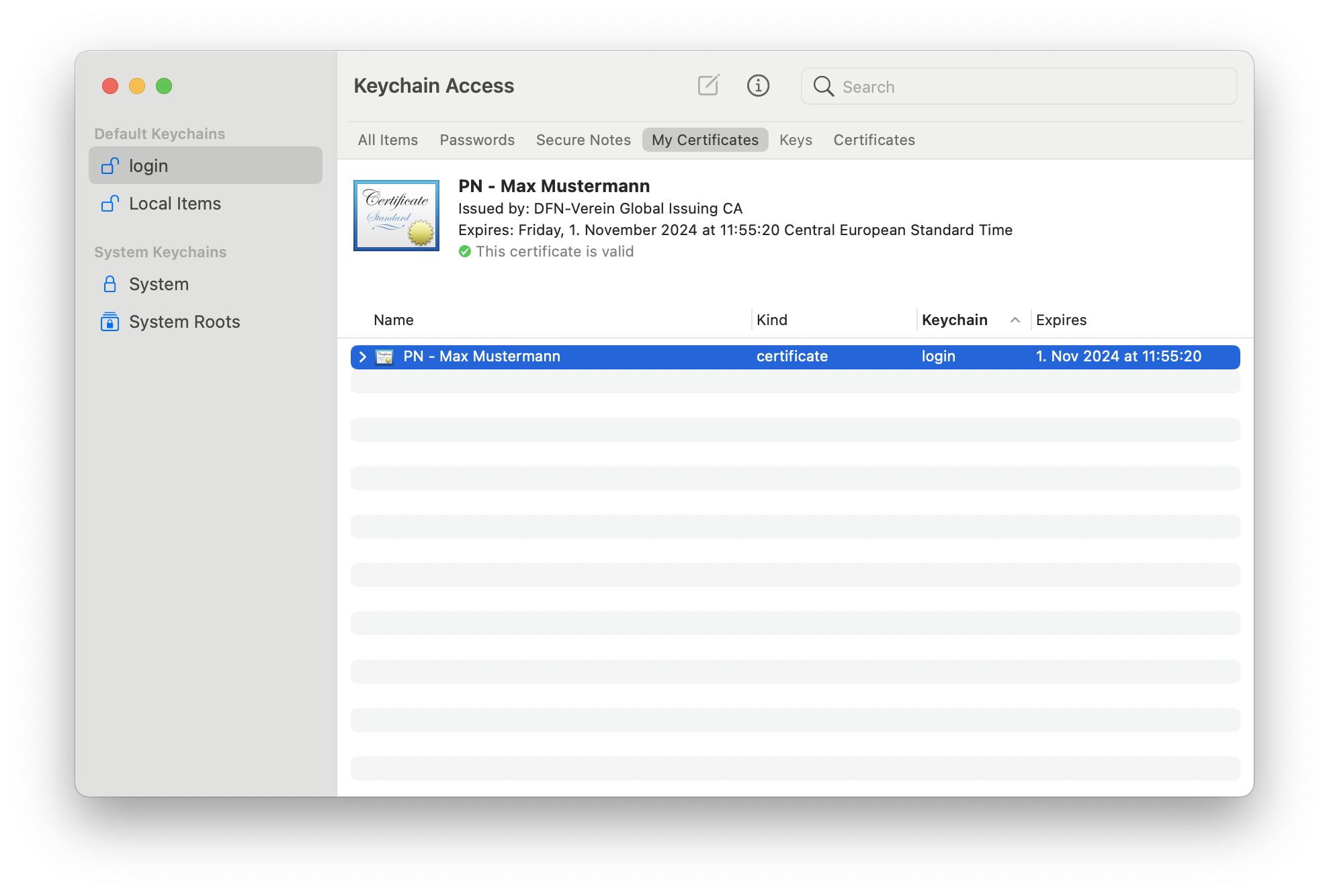 Open the keychain management and select the keychain "Login". In the field at the bottom left, you can then set the filter to "Certificates".
