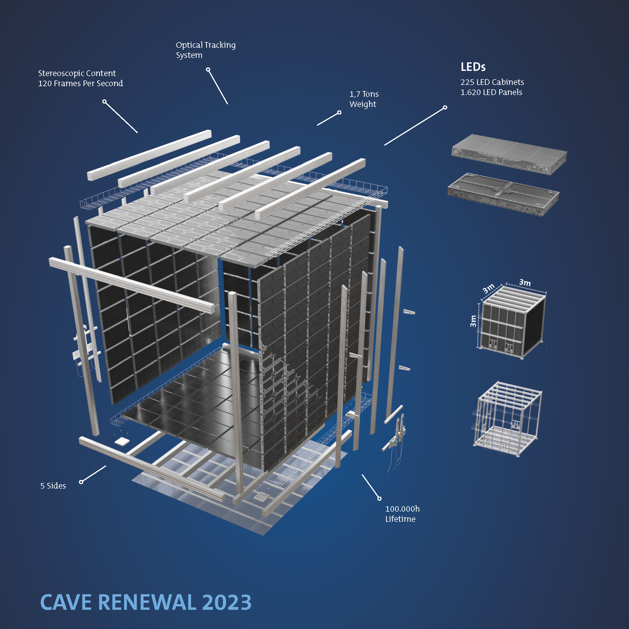 Die Ursprungsidee der 5-seitigen Projektionsinstallation basiert auf dem Konzept der CAVE (CAVE Audio Visual Environment) von Carolina Cruz-Neira. Hierbei befindet sich der Benutzer in einem Würfel mit projizierten Seitenflächen, Boden und Decke, welche sein Blickfeld vollständig abdecken. Im Gegensatz zur Powerwall gewinnt der Benutzer nicht nur den Eindruck mit einer virtuellen Welt zu interagieren, er hat das Gefühl, sich förmlich in ihr zu befinden. Im Jahr 2023 wurde die ursprünglich CAVE, bestehend aus 5 Projektionsflächen, die mit jeweils 2 Beamern bespielt wurden, durch eine 5-seitige CAVE bestehend aus LED-Walls, ersetzt. Die Projektion erfolgt mit Hilfe aktiver Stereodarstellung. Die Projektionsinstallation wird durch einen Rechnerverbund von 7 synchronisierten Knoten angesteuert, wobei 5 Knoten des Systems zur Bildgeneration dienen (jeweils einer pro Wand) und 1 Knoten zur Ansteuerung der Darstellungsknoten und zur Aktualisierung der Szene. Der 7. Knoten dient als Backup für den Steuerknoten. Sie besitzt ein fest installiertes Positionsermittlungssystem mit 4 Kameras an der Decke. |