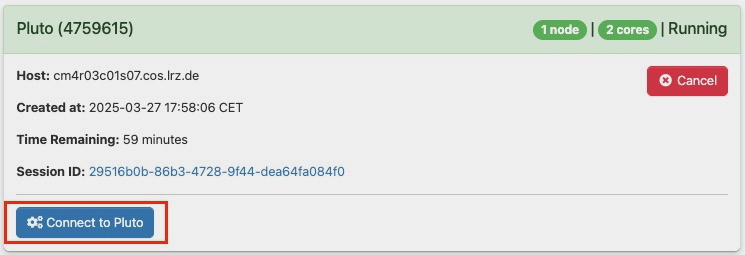 Once the resources are allocated, you can click on “Connect to Pluto“ to log into Pluto.