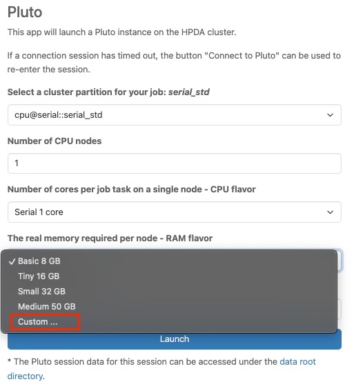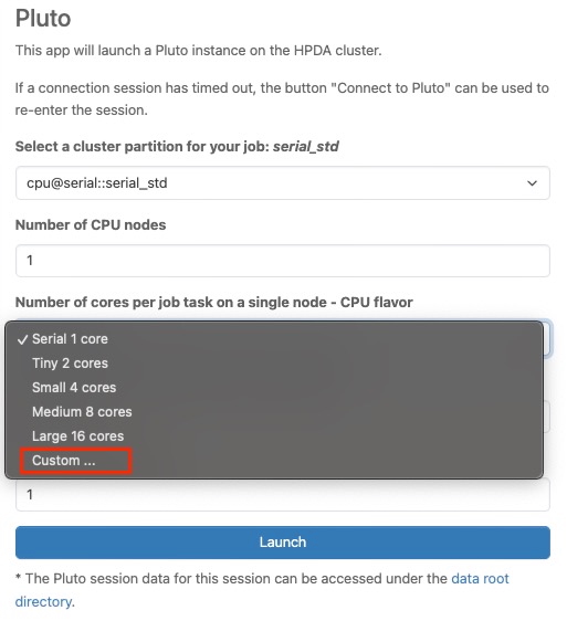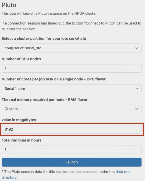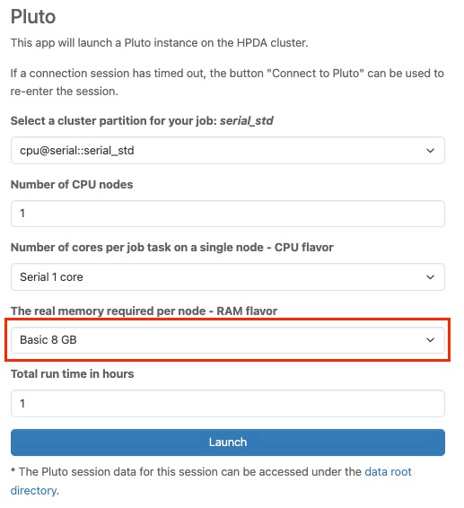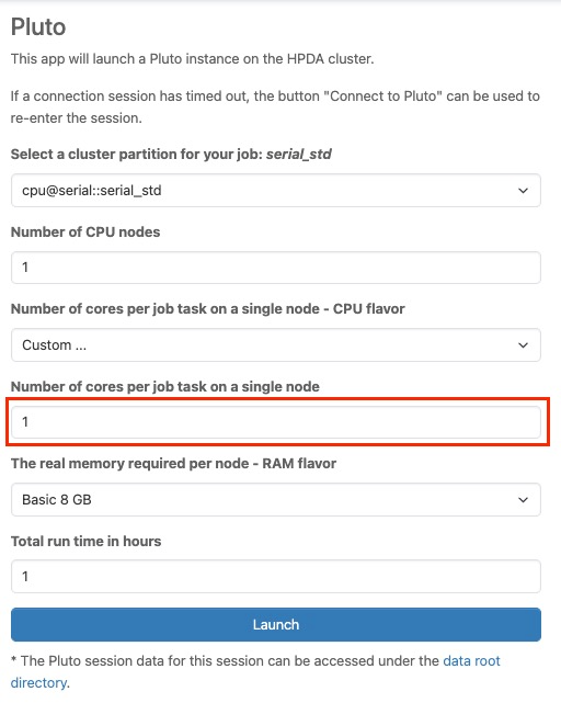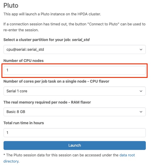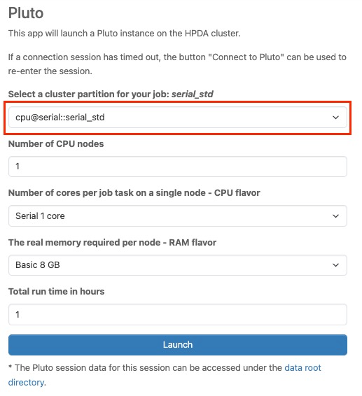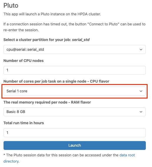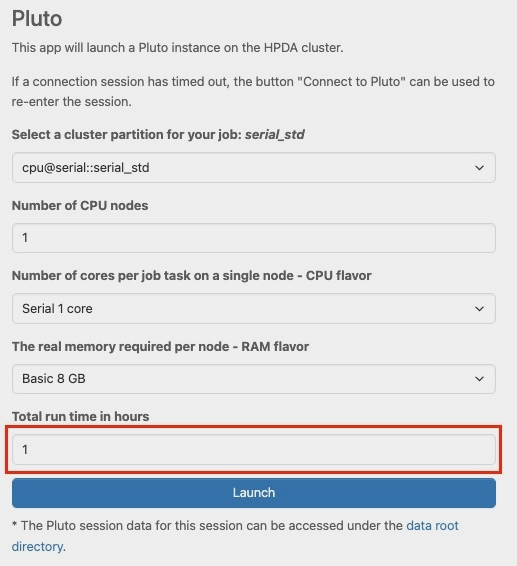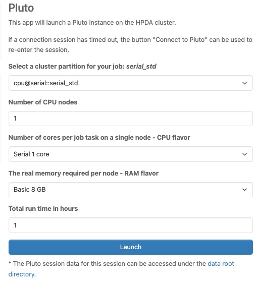 After clicking Pluto from the panel,  you will find yourself on an overview page providing important information about the resources you want to use. Before you can launch Pluto,  you must provide some information about the resources you want to use.