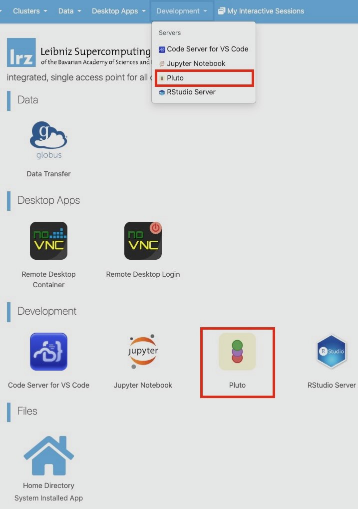 Pluto can be accessed by selecting it from the drop-down list under the Development section in the upper menu bar, or by clicking the Pluto icon on the dashboard.