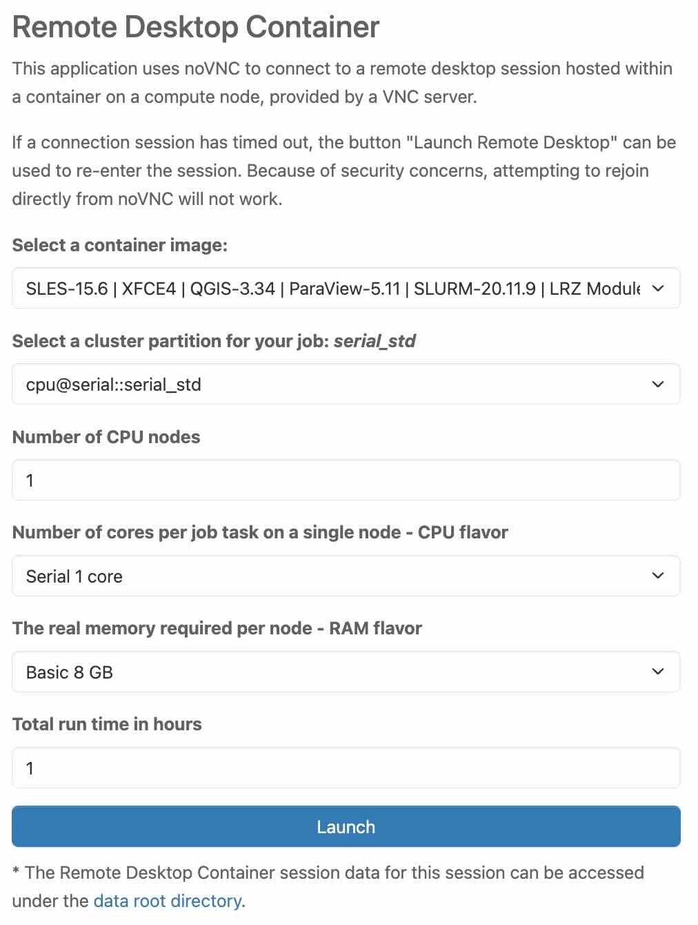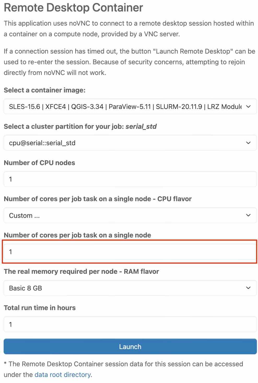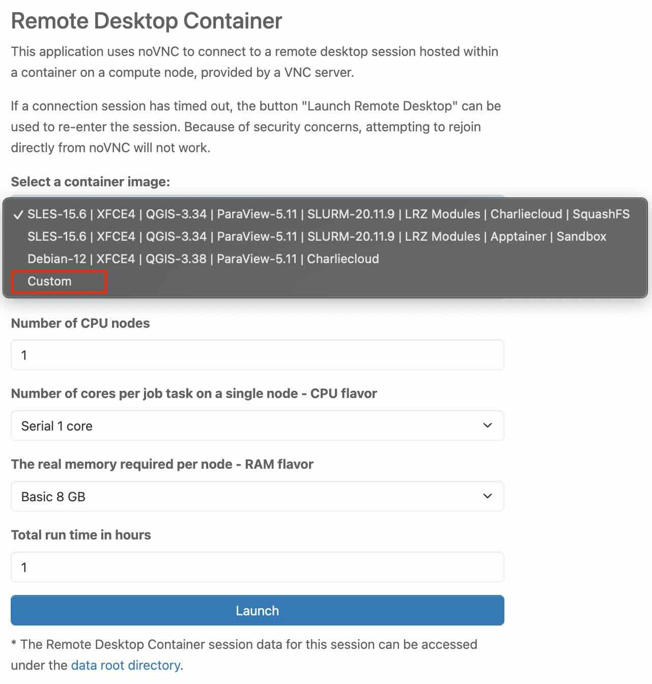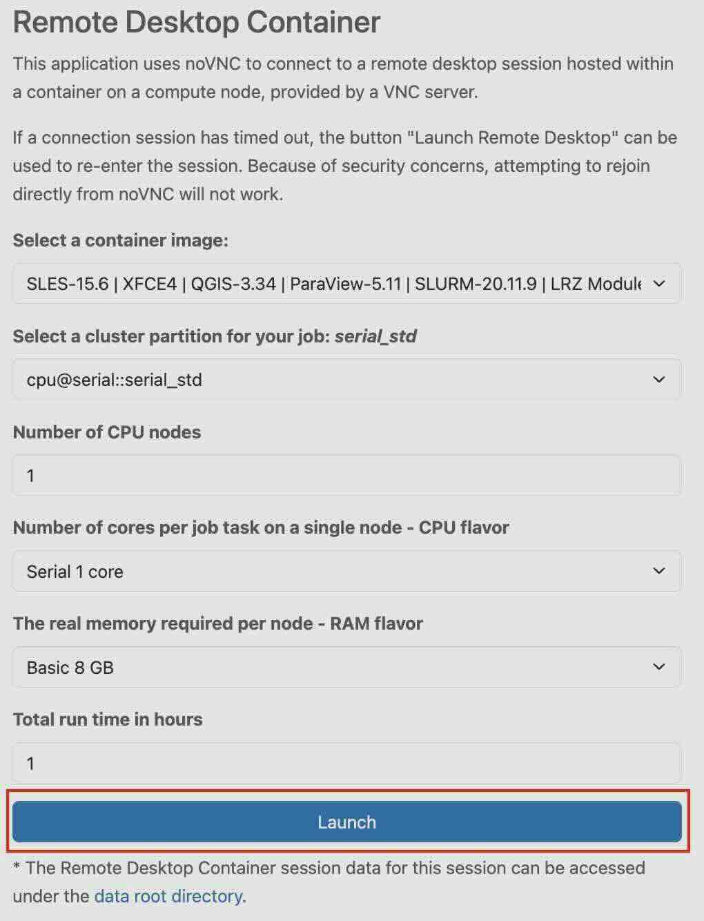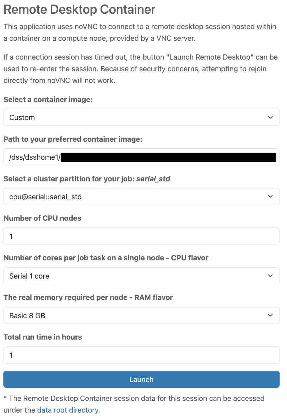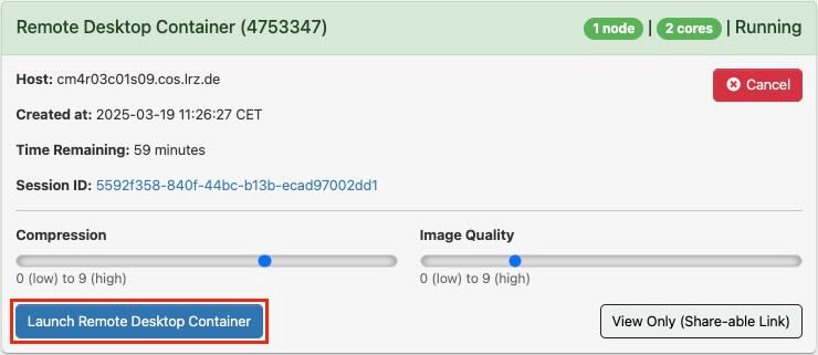 Once the resources are allocated, you can click on “Launch to Remote Desktop Container“ to log into the Remote Desktop Container.