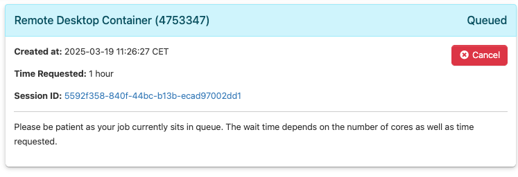 After you click the “Launch” button, you will find yourself on a page showing the starting status of your application. You need to wait as your job will be in the queue. The wait time depends on the number of cores as well as the time requested.