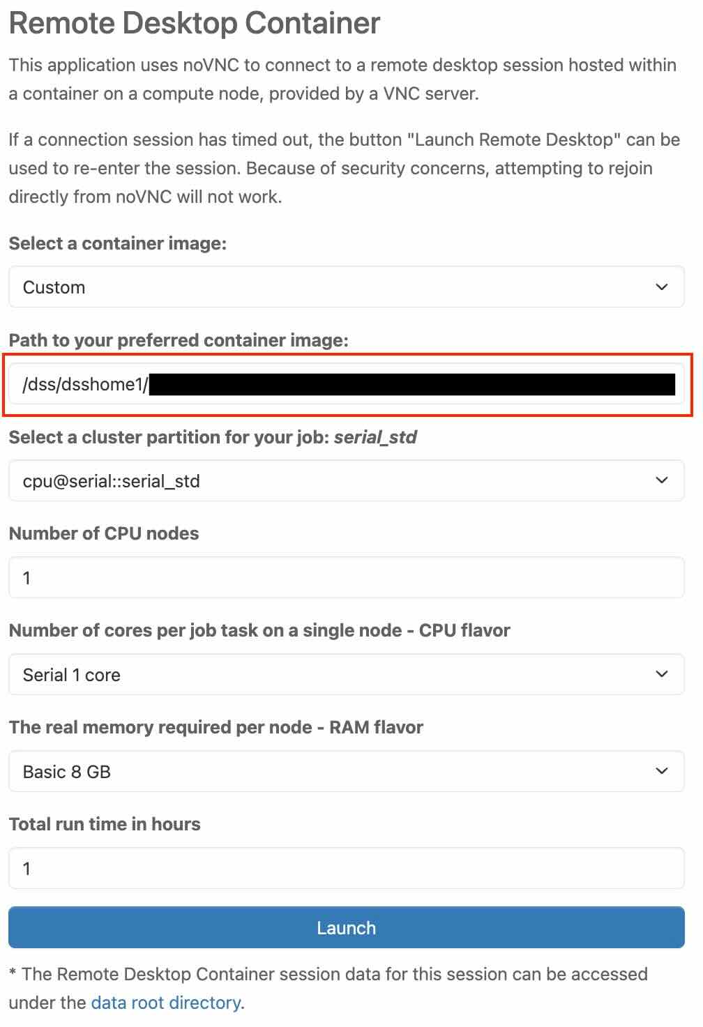 In the "Path to your preferred container image" tab, you enter the name or path of your container that you previously created in your home folder.