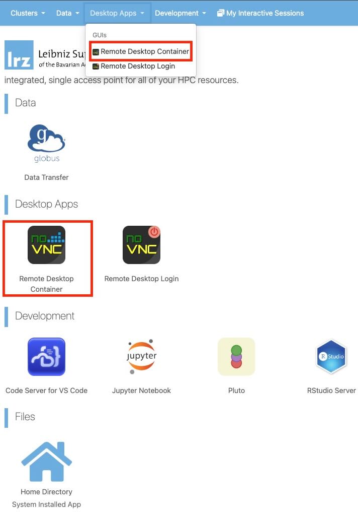 Remote Desktop Container can be accessed by selecting it from the drop-down list under the Desktop Apps section in the upper menu bar, or by clicking the Remote Desktop Container icon on the dashboard.
