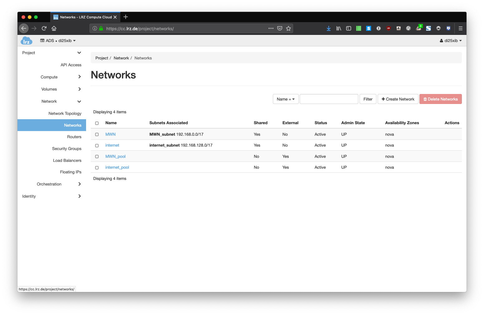 - Back on the Networks overview page you can see your newly created network. The shared attribute is set to No which means that this network can be only be used by you.