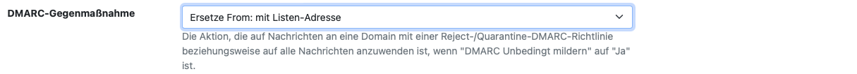 • oder, wenn der ursprüngliche Absender zumindest noch im reply-to-Header enthalten sein soll, können Sie unter "DMARC-Hilfsmaßnahmen" mit der Option "DMARC-Gegenmaßnahme: Ersetze From: mit Listen-Adresse" einstellen, dass als Absenderadresse immer die Adresse der Mailingliste selbst eingesetzt werden soll und der ursprüngliche Absender dann in den reply-to-Header hinzugefügt wird. Der Anzeigename des Absenders wird dann zu "Absendername via Listenname".