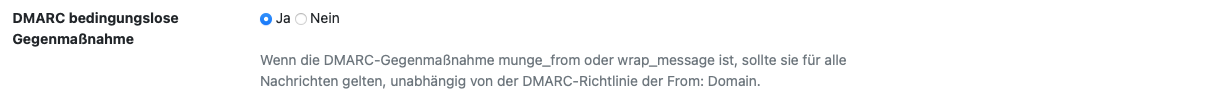 Bei der folgenden Option ("DMARC bedingungslose Gegenmaßnahme") geht es darum, unter welchen Bedingungen eine der oben beschriebenen Aktionen erfolgen soll. Hier empfehlen wir die Voreinstellungen zu belassen, d.h. die Aktion für alle Nachrichten, unabhängig von der DMARC-Richtlinie der From: Domain, durchzuführen.
