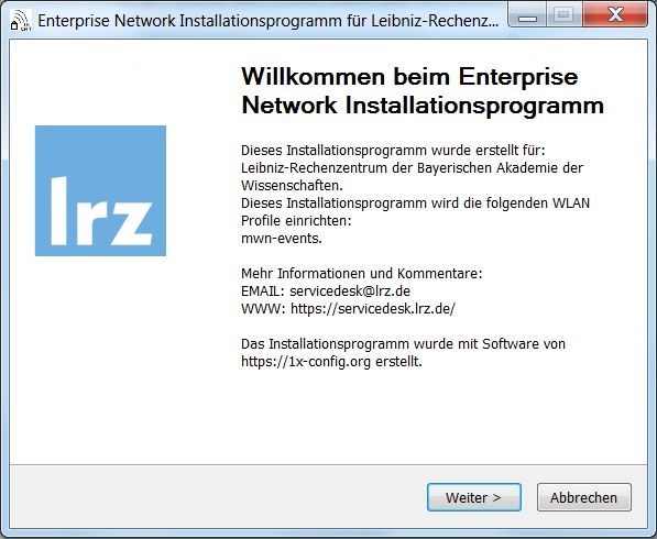 Das Tool kann über eine Verbindung mit der SSID lrz unter https://doku.lrz.de/konferenz-wlan-mwn-events-10745886.html geladen werden.