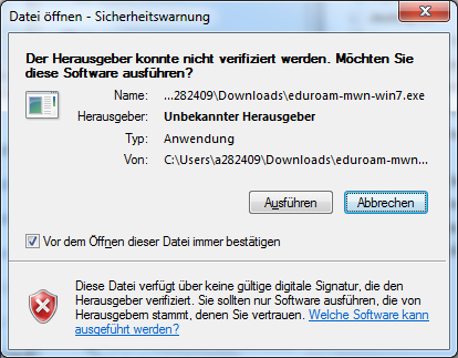 Nach dem Starten des Konfigurationstools kommt die Windows Sicherheitsmeldung für Dateien aus dem Internet. Herausgeber des Tools war die Firma NSP Network Security Proliferation UG (ehemals https://802.1x-config.org).