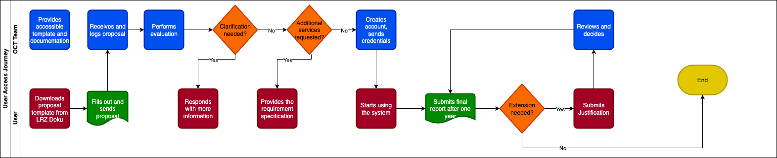 The duration of each project is set to one year, with the possibility of applying for extensions, by submitting the one-year final report and providing justification. A graphics representing the user journey in applying to system access and using it is reported below.