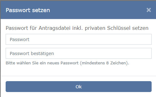 Wenn Sie auf Antragsdatei speichern klicken, werden Sie noch nach einem Paßwort gefragt: