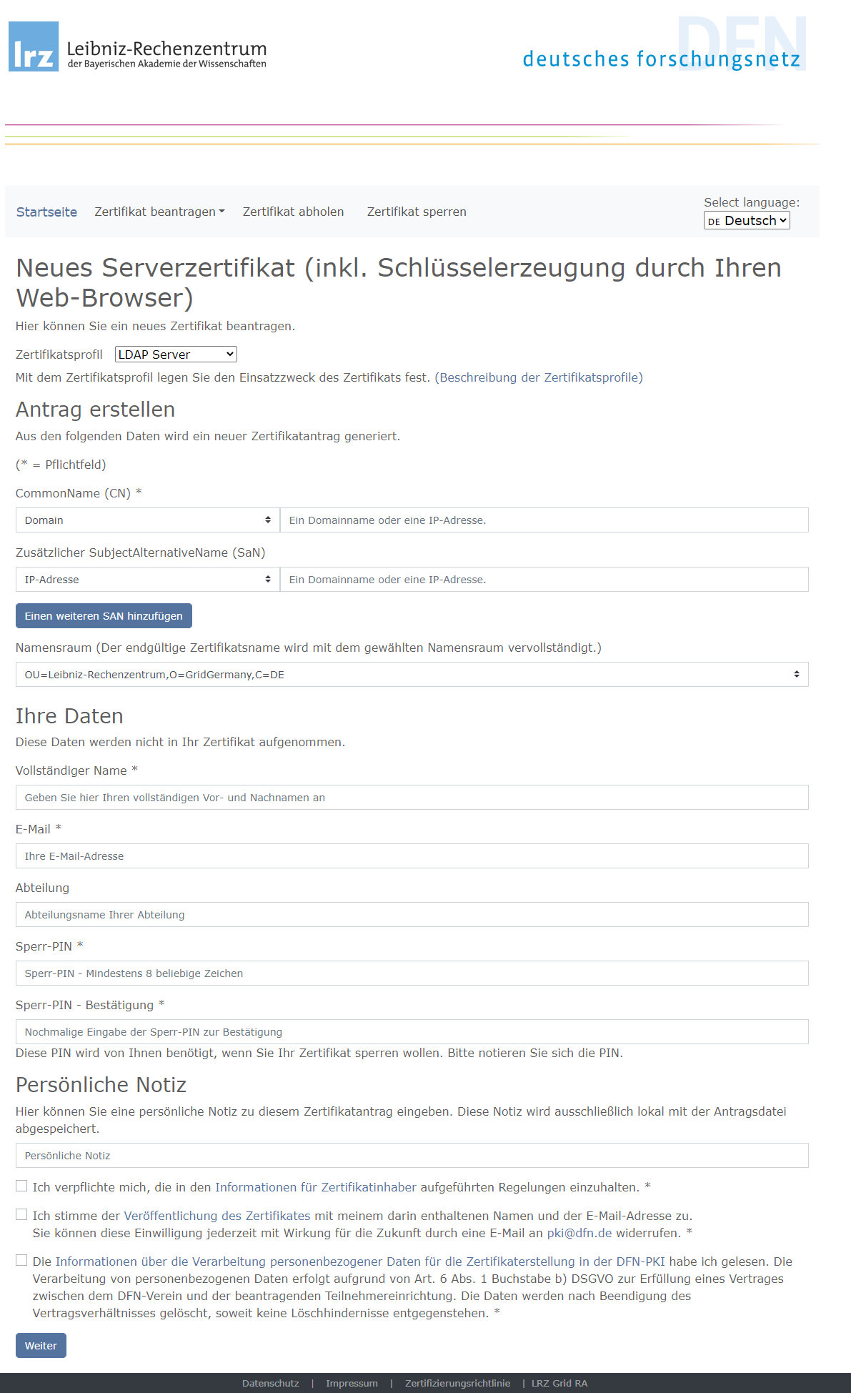 Die Seite Serverzertifikat beantragen sieht dann beispielsweise so aus: