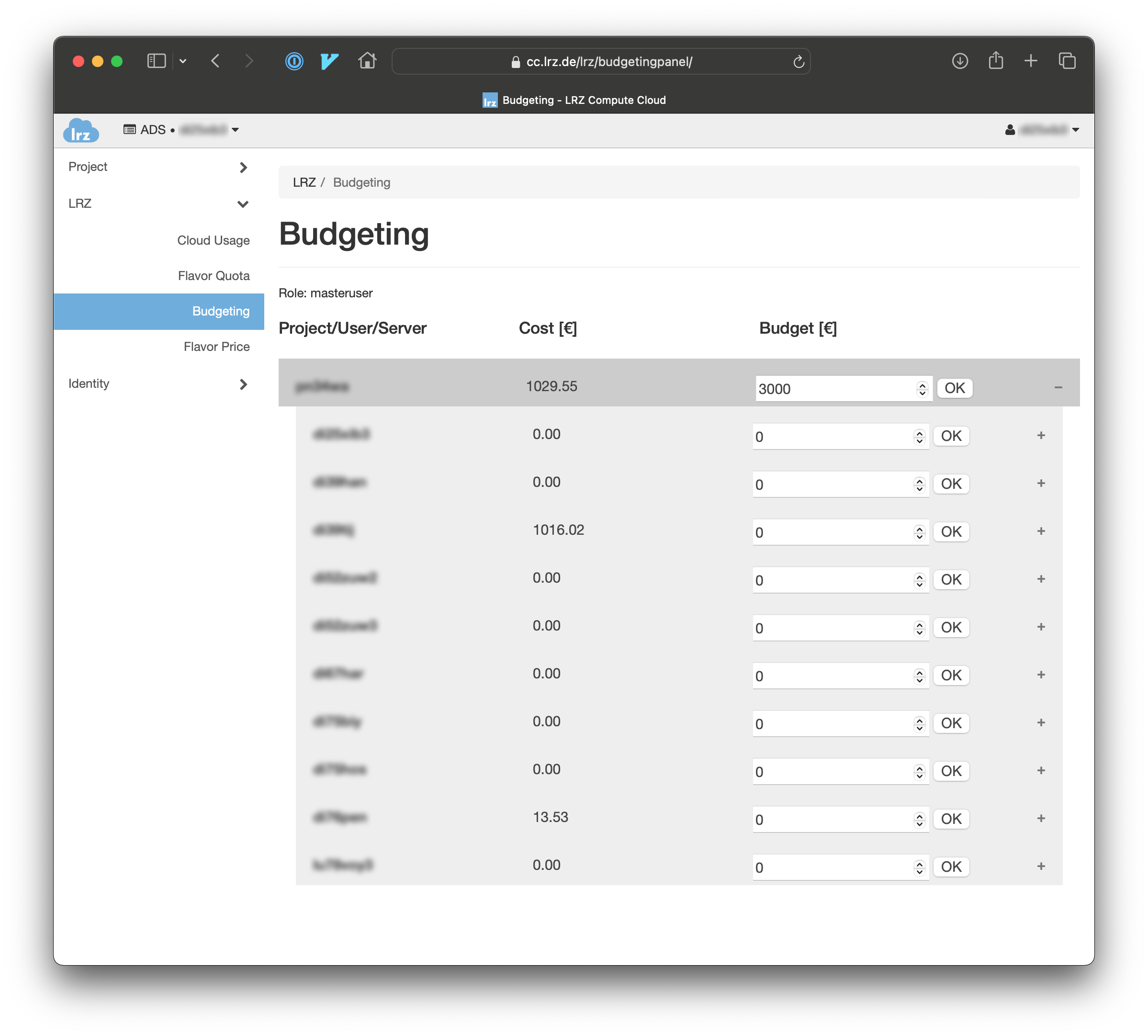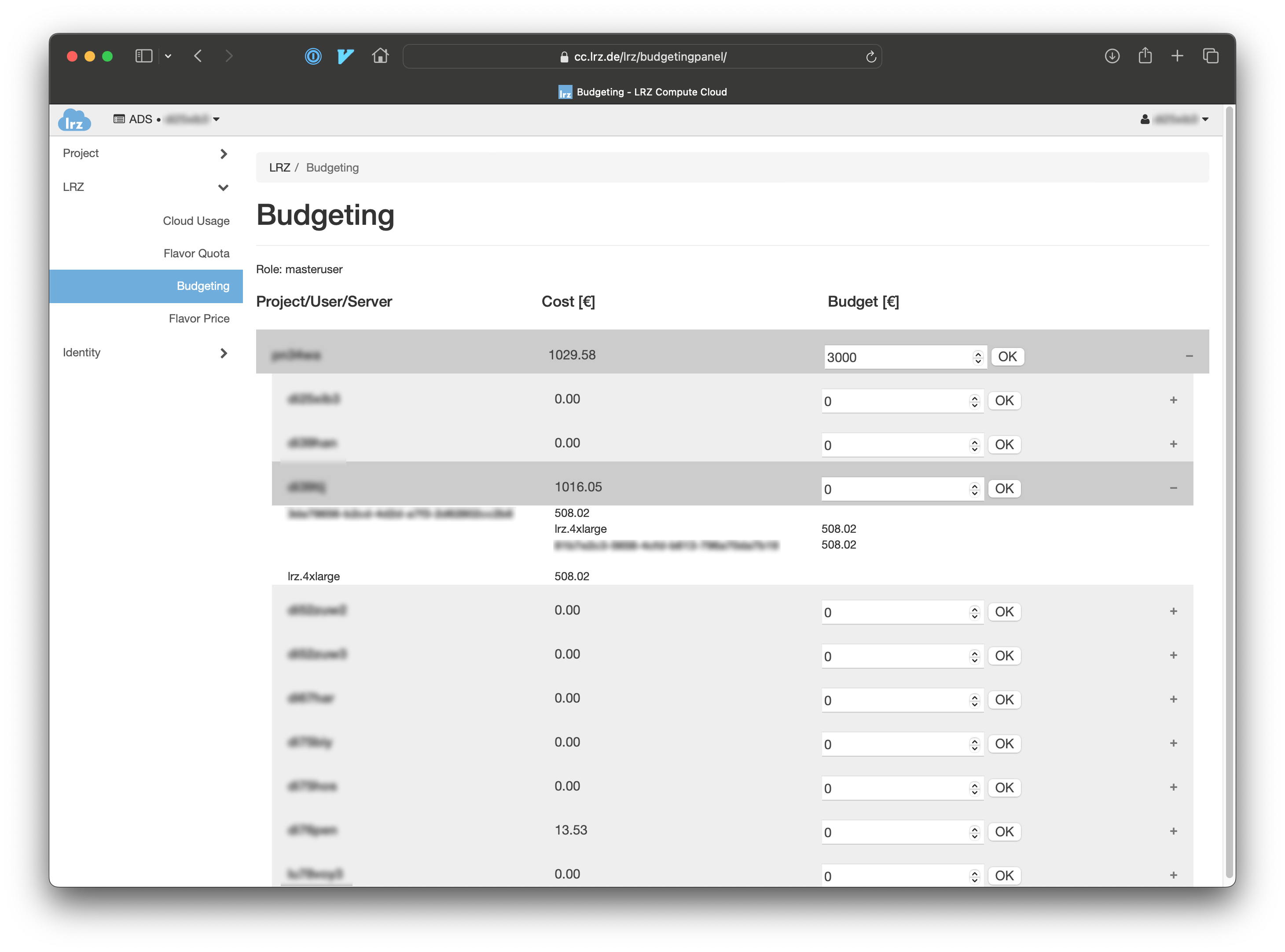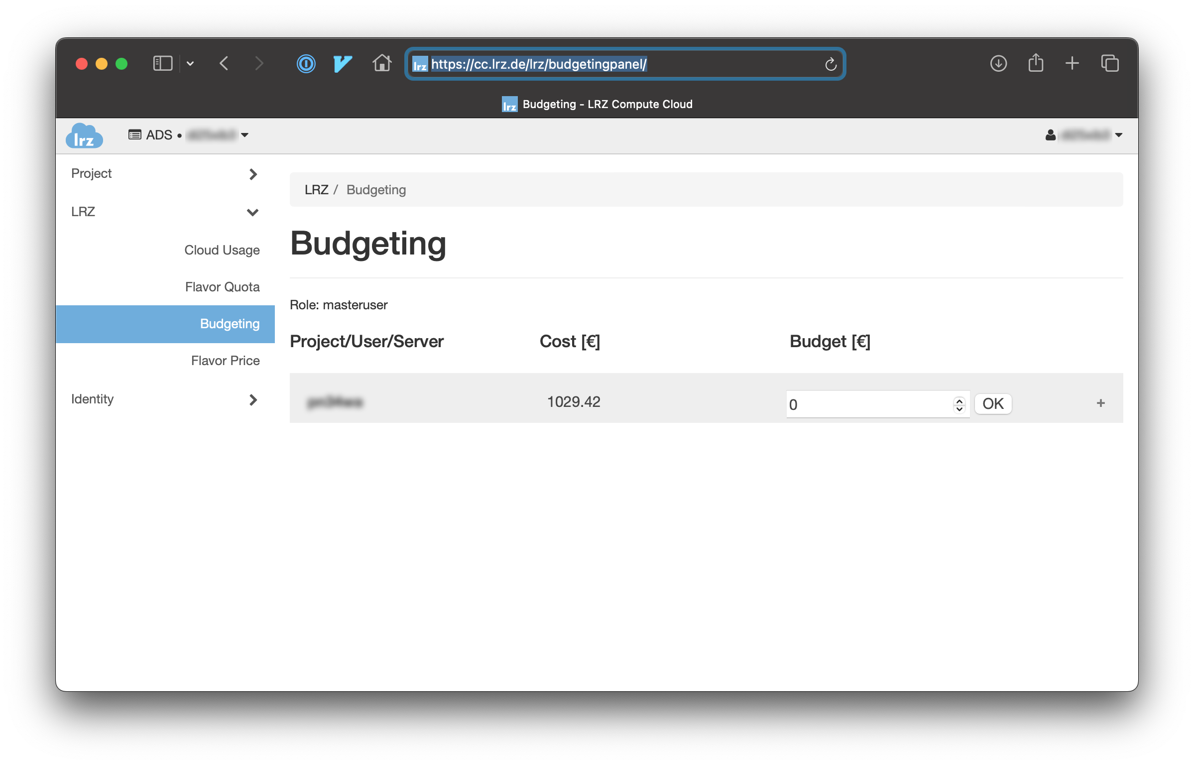 Budgets can be managed from the budgeting overview page in the LRZ Compute Cloud web interface. In order to access this page you need a cloud-enabled account within your project yourself. If you do not have such an account yet you must create one and provide cloud permissions to this account.