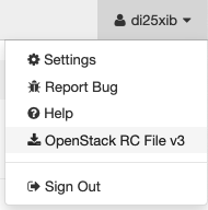 - Log in to https://cc.lrz.de with your username, click on your username on the upper right corner of the screen and download the OpenStack RC File v3 to your computer.