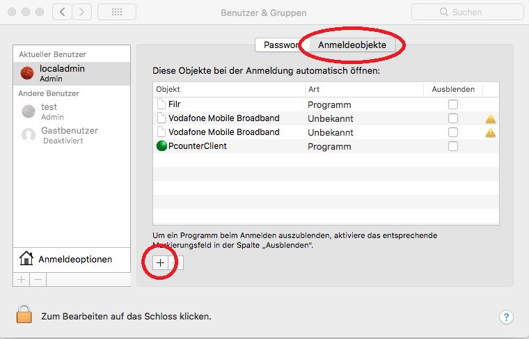 Mit Klick auf "+" unter dem Fensterbereich die PcounterClient.app hinzufügen und die Umgebung verlassen. - Anschließend einen Neustart des Systems durchführen.