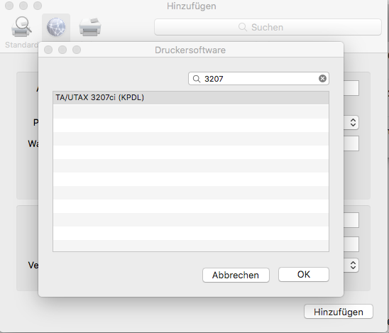 - Unter Verwenden "Software auswählen" klicken und aus der Liste "UTAX_TA 3207ci auswählen. Mit OK/Hinzufügen beenden und Umgebung verlassen