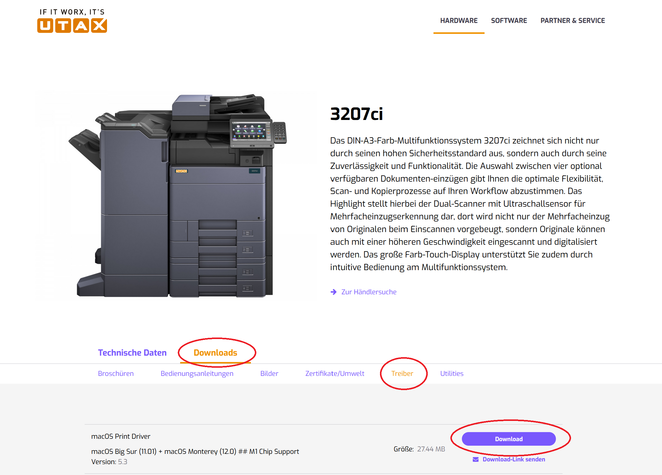- Dort den "macOS Print Driver Big Sur (11.01) ## + macOS Monterey (12.0) ## M1 Chip Support Version:V5.3" herunterladen (eventuell gibt es mittlerweile eine neuere Version)