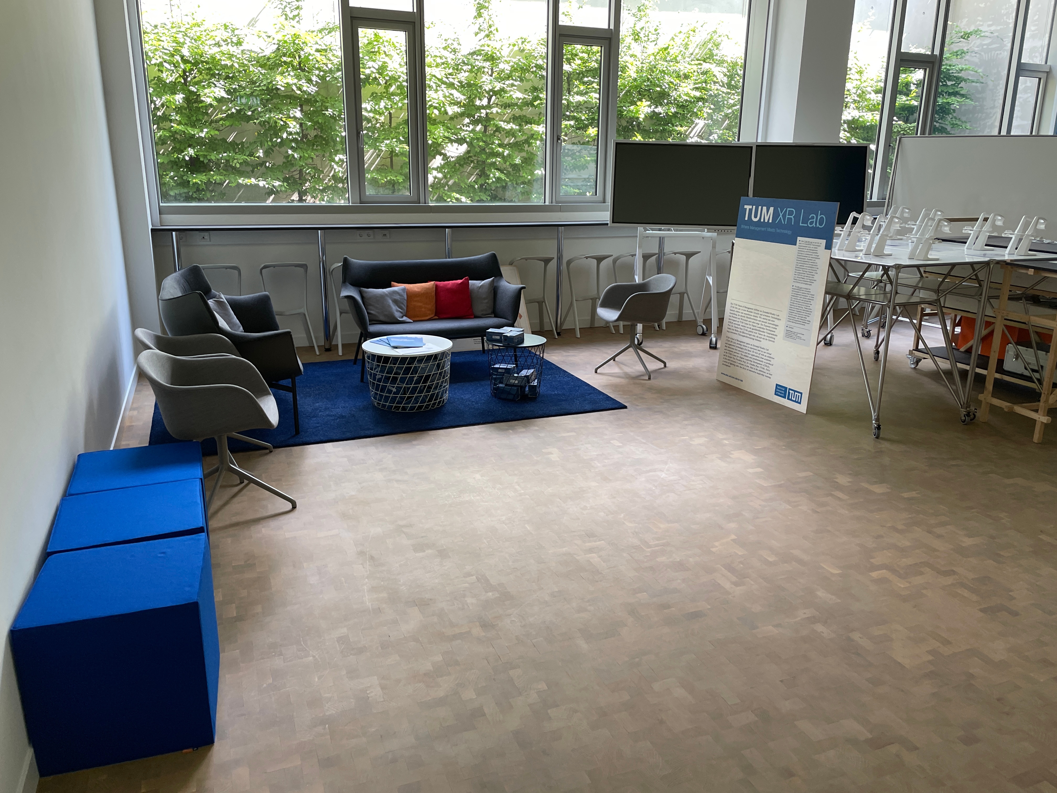 Furniture: Various seating options (cubes, sofa, chairs), mobile whiteboards, lockable (with campus card) cabinets
