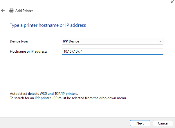• In the Hostname or IP address field, enter the IP address of the printer (see list below). In this example we use the IP address 10.157.107.7 from one printer in room D.4.10.