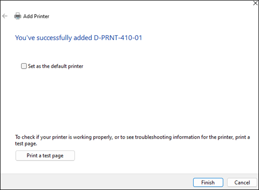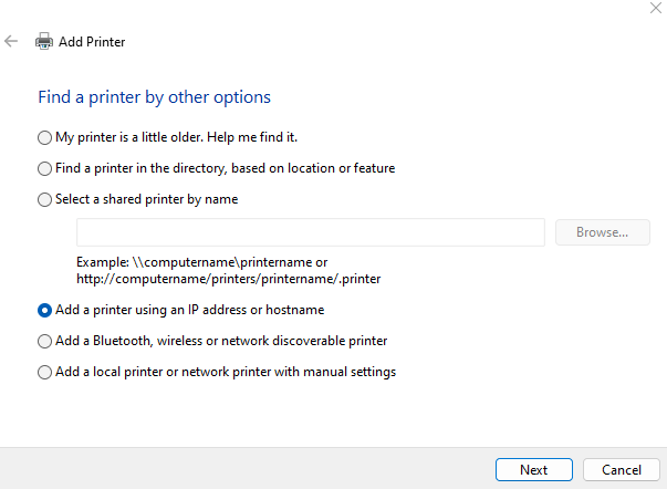 • Windows will search for available printers. The printer will not appear in the list. Click on The printer that I want isn't listed. Then click on Add manually.