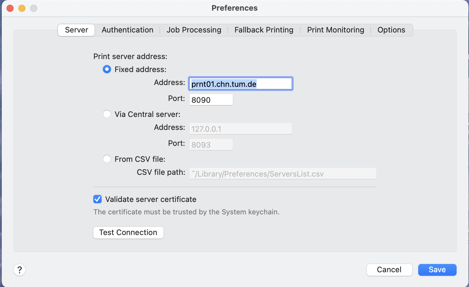 Printing from the wired network is available by default. If you are on the wifi, make sure to have an active EduVPN connection