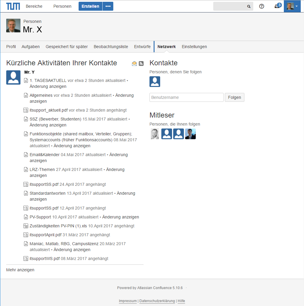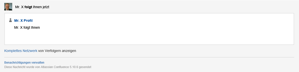 In Confluence können Personen anderen Personen folgen. Jede Person, der eine andere Person folgt bekommt zur Information vom System eine Informations-Mail gesendet (die Benachrichtigungsoption muss in den persönlichen Einstellungen aktiviert sein).