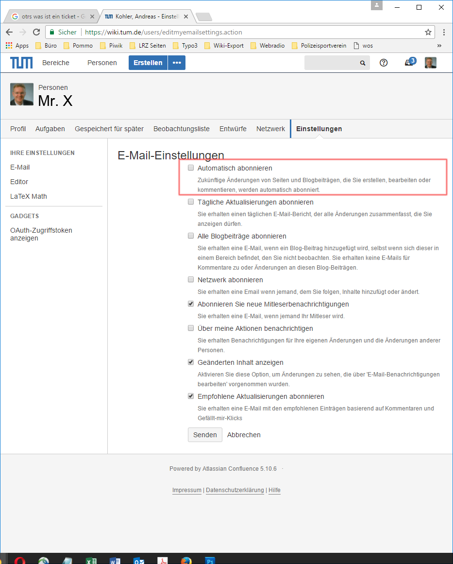 Schritt 4: Sie gelangen zum Fenster "E-Mail-Einstellungen aus nachfolgender Abbildung. Klicken Sie hier auf den Button "Bearbeiten", deaktivieren Sie die rot umrandete Option "Automatisch abonnieren" und klicken Sie abschließend auf "Senden".