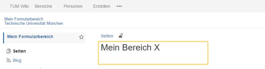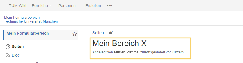 Im Wiki-System der Technischen Universität München stehen in jedem Wiki-Bereich insgesamt zwei Designvorlagen (Templates) zur Verfügung. Werden gemäß dem orange markierten Bereich aus nachfolgender Abbildung unterhalb der Überschrift Details des jeweiligen Seitenbearbeiters (Nachname, Vorname, Zeit der Änderung) angezeigt, so ist das Template "Globale Gestaltung" als Designvorlage für den Wiki-Bereich ausgewählt.