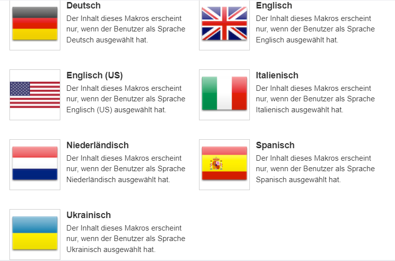 Der Inhalt des Makros zeigt nur die Sprache X (X:= Deutsch, Englisch, Italienisch, Niederländisch, Spanisch, Ukrainisch) an, wenn der Benutzer als Sprache X ausgewählt oder als Browsersprache eingestellt hat.