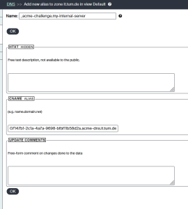 ) erzeugt, welche Sie über einen CNAME Eintrag (_acme-challenge.my-internal-server.it.tum.de