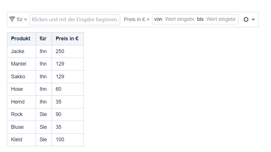 Ziel: Eine Seite "Boutique" in welcher eine Tabelle mit verschiedenen Textilprodukten für Männer und Frauen sowie Preisen enthalten ist. Gefiltert werden soll in der Tabelle nach dem Geschlecht sowie nach dem Preis in Form eines Intervalls.