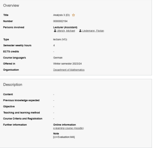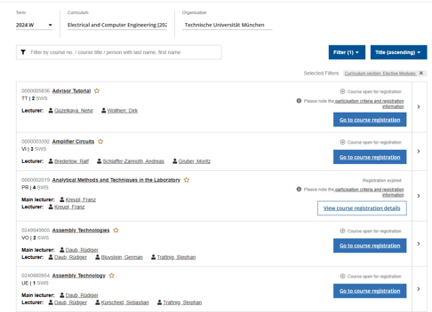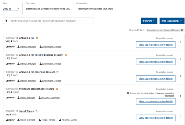 When you click on “Show all courses”, the application “Courses filtered” is only called up for this section. You select the desired semester (e.g. 23W):