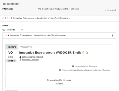 Each element comes with a checkbox for your “selection”. (The example shown is an exam). The yellow icon and text above the elements inform you how many credits are yet to be covered with more selections. Changing a selection made is currently only possible via the student office. Therefore, please consider the note shown when selecting an element!