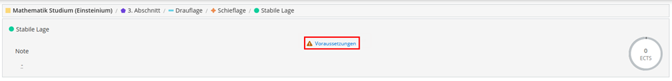 If a course comes with certain requirements, a “Requirements” link will be displayed. This link is only shown at exam level and if the requirements have not been met.