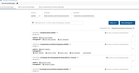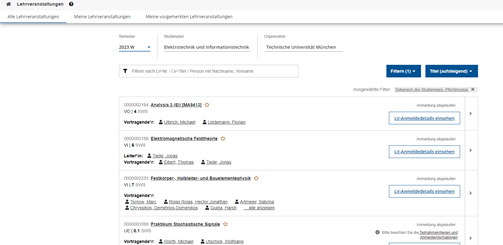 beim Klick auf „Alle Lehrveranstaltungen anzeigen“ wird die Applikation Lehrveranstaltungen gefiltert nur auf diesen Teilbereich aufgerufen. Sie wählen das gewünschte Semester (z.B. 23W) aus:
