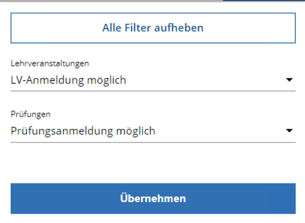 b) Es ist gerade Anmeldephase und ich möchte auf einen Blick alle Lehrveranstaltungen und Prüfungen zu denen ich mich anmelden kann, sehen: Filter aufklappen „LV-Anmeldung möglich“ und/oder „Prüfungsanmeldung möglich“ auswählen.