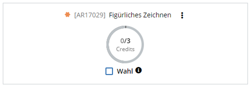 Direkt am Element kann eine Checkbox aktiviert werden, die festlegt, dass es „gewählt“ wird (am Screenshot: eine Prüfung). Über den Elementen wird ein gelbes Icon mit Text angezeigt, der erklärt, wie viele Credits noch benötigt werden. Das Aufheben einer solchen Wahl ist derzeit nur im Studierendensekretariat möglich. Beachten Sie daher bitte unbedingt den Hinweis, wenn Sie ein Element auswählen!