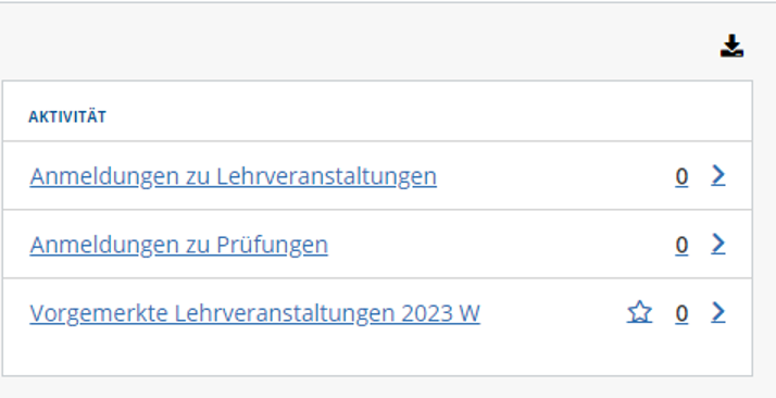 Mit Klick auf den Download Button über dem Bereich „Aktivität“ werden alle möglichen Dokumente angezeigt, die zum Studium heruntergeladen werden können.