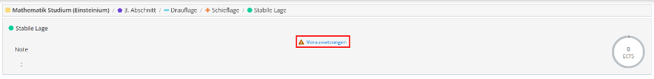 Gibt es Voraussetzungen zur Veranstaltung, wird im oberen Bereich der Link „Voraussetzungen eingeblendet. Dieser Link wird nur auf Prüfungsebene angezeigt und wenn Voraussetzungen noch nicht erfüllt sind.