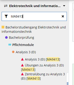 2.Ich möchte wissen welche Lehrveranstaltungen im bestimmten Semester aus dem Teilbereich Pflichtmodule angeboten wurden. Gehen Sie zu den gewünschten Knoten (z.B. Regelknoten Pflichtmodule); klicken Sie auf das Symbol rechts von dem Knotennamen
