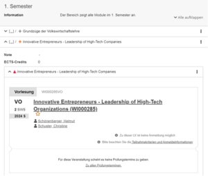2. Ich bin mir noch nicht ganz sicher, wie ich mein nächstes Semester planen soll: Rufen Sie den Semesterplan auf, um zu sehen, was Sie laut Studienplan als Nächstes belegen sollten. Mit dem Ausklappen der Elemente können Sie sich direkt anmelden.