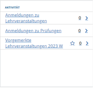 3. Ich möchte alle meine Anmeldungen zu Lehrveranstaltungen/Prüfungen in diesem Semester sehen: Rufen Sie in „Mein Studium“ im Bereich „Aktivität“ die Links „Anmeldungen zu Lehrveranstaltungen“ oder „Anmeldungen zu Prüfungen“ auf.