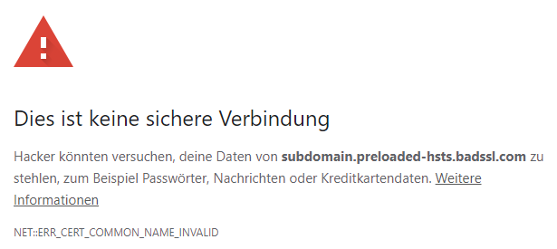 Wie es aussieht wenn Sie eine Website aufrufen die durch HSTS geschützt ist aber keine korrekte Verschlüsselung unterstützt, sehen Sie beispielsweise hier: