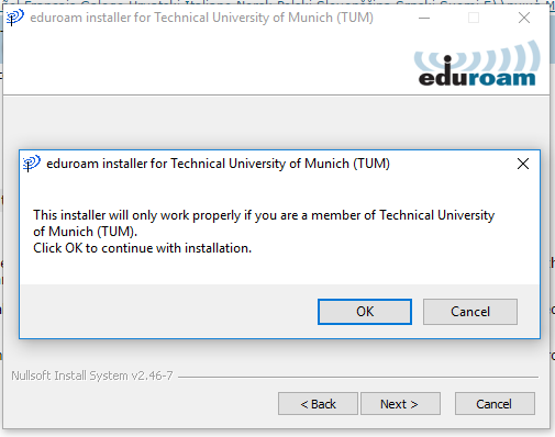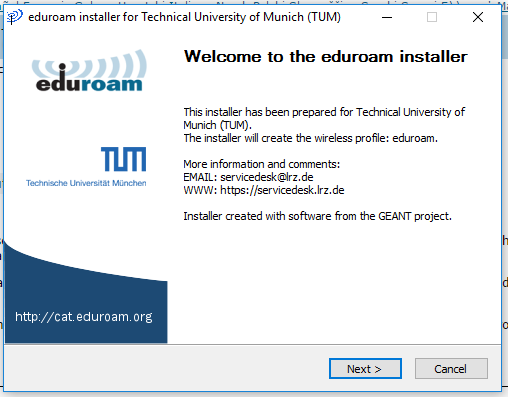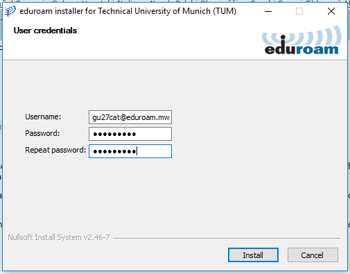 Enter your user credentials as shown: TUM-ID@eduroam.mwn.de, e.g. gu27cat@eduroam.mwn.de.