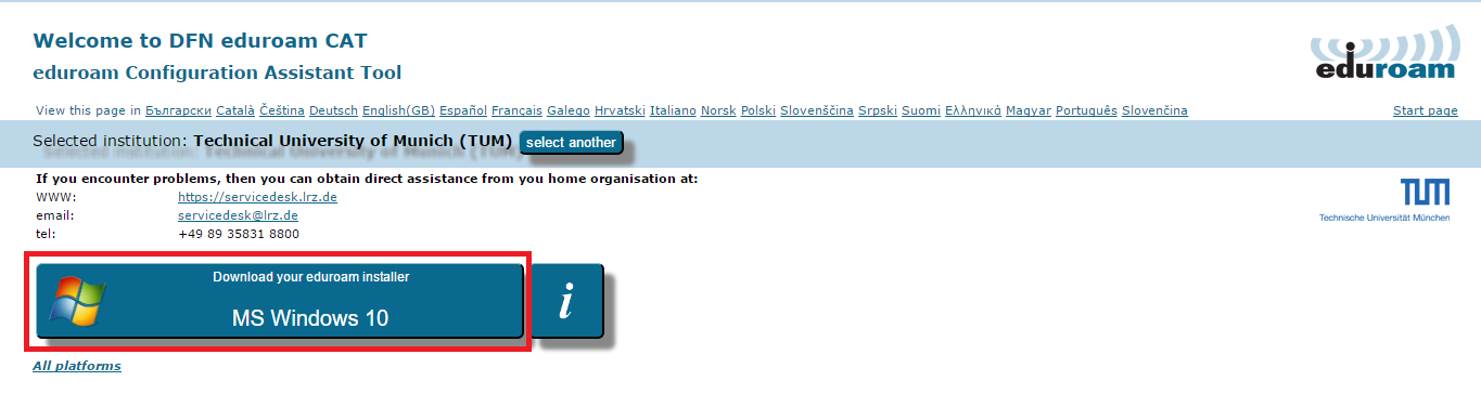Open https://cat.eduroam.de/ to download the needed configuration profile.