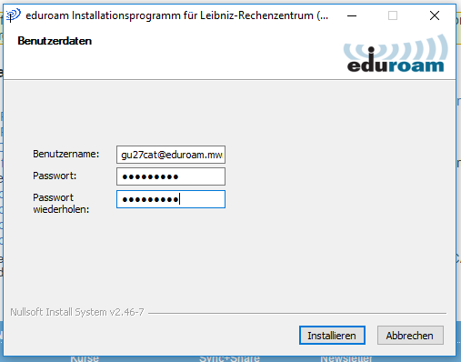 Enter your user credentials as shown: TUM-ID@eduroam.mwn.de, e.g. gu27cat@eduroam.mwn.de. (Benutzername)