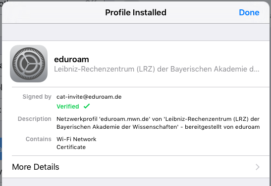 Click on "Done" to finally install the configuration profile. Your device connects automatically to the Wi-Fi.