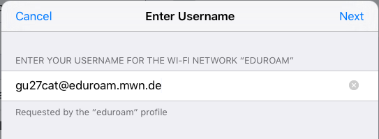 Enter your user credentials as shown: TUM-ID@eduroam.mwn.de, e.g. gu27cat@eduroam.mwn.de.