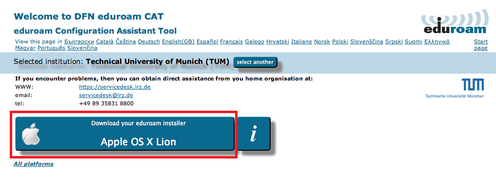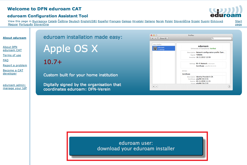 Open https://cat.eduroam.de/ to download the needed configuration profile for your Apple macOS device.